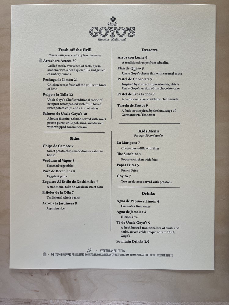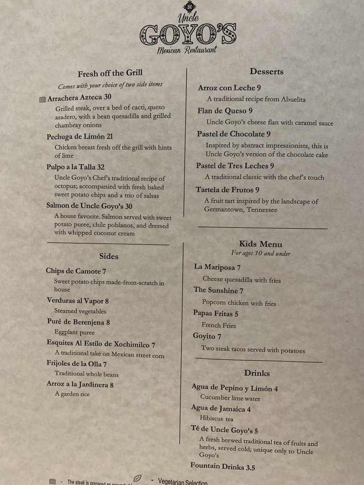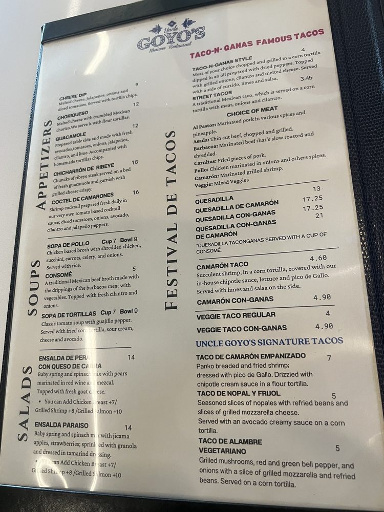 Uncle Goyo’s Mexican Restaurant in Germantown, TN offers a delightful menu of soups, tacos, and salads. With amenities like outdoor seating, garage parking, and delivery options, this restaurant caters to a variety of dining preferences. Customers rave about the flavorful dishes, such as the Elote sampler with hot Cheeto powder, fried shrimp tacos, and barbacoa. The restaurant has received praise for its exceptional service and inviting ambiance, making it a popular choice for families and couples alike. Whether you're in the mood for traditional Mexican cuisine or innovative fusion options, Uncle Goyo's has something to satisfy every palate. A visit to this restaurant promises a memorable dining experience filled with delicious food and warm hospitality.
